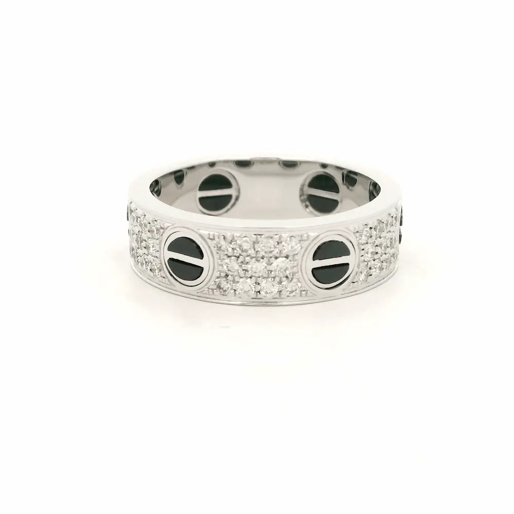 Looking for a Cartier love ring black ceramic; in 18K solid gold? This timeless piece gives you the iconic look you love. It offers lasting quality and clean, modern style. The design follows the original Cartier one diamond love ring paved ceramic (reference number B4207600). It shows off the same flowing shape, screw motifs, and minimal lines that define the Love collection.